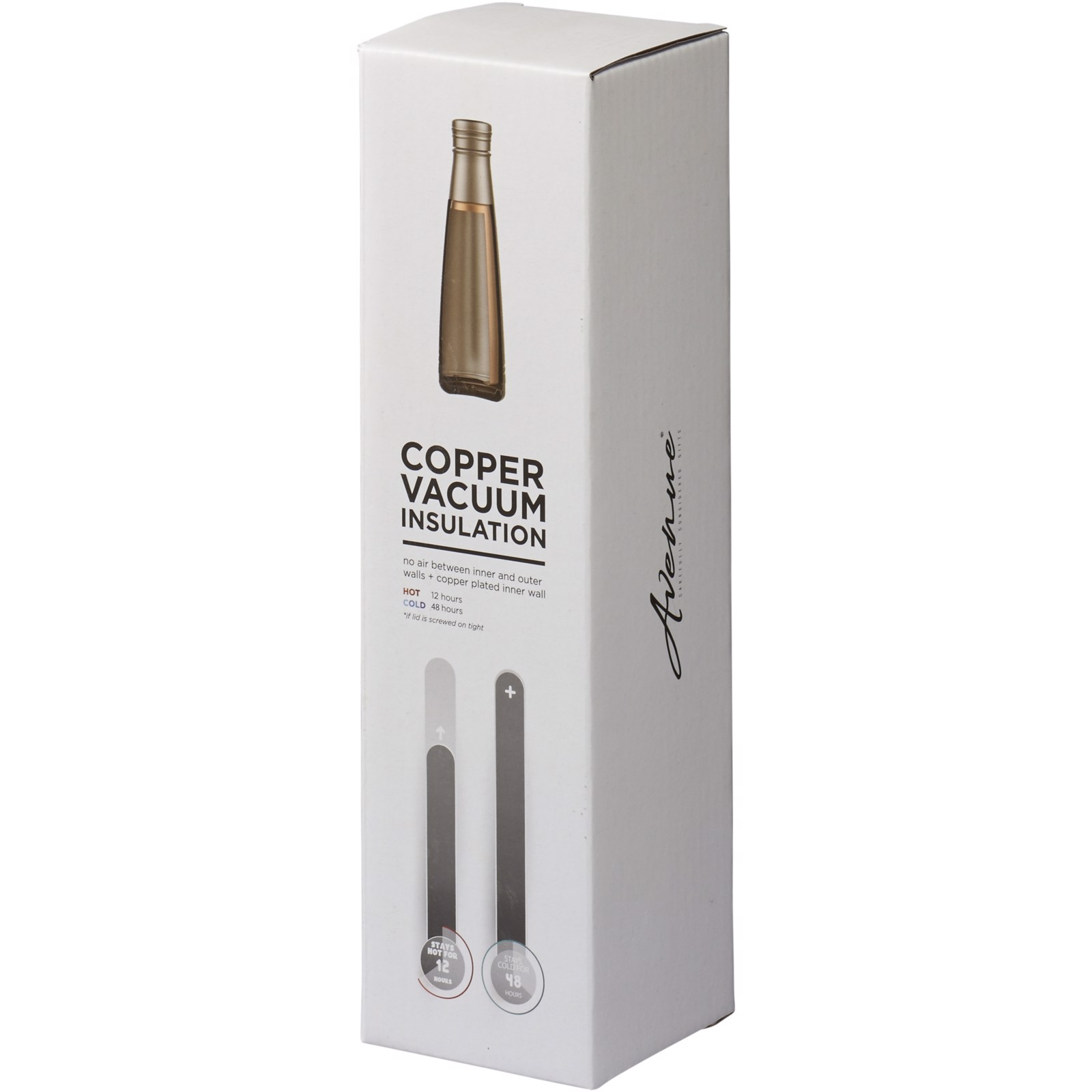 Die Duke Isolierflasche ist aus doppelwandigem Edelstahl 18/8 mit Vakuumisolierung. Die Innenwand ist mit Kupfer plattiert, für ultimative Leitfähigkeit, um Getränke für bis zu 12 Stunden heiß zu halten und bis zu 48 Stunden kalt. Volumen 500 ml. Verpackt in einer Avenue Geschenkbox.