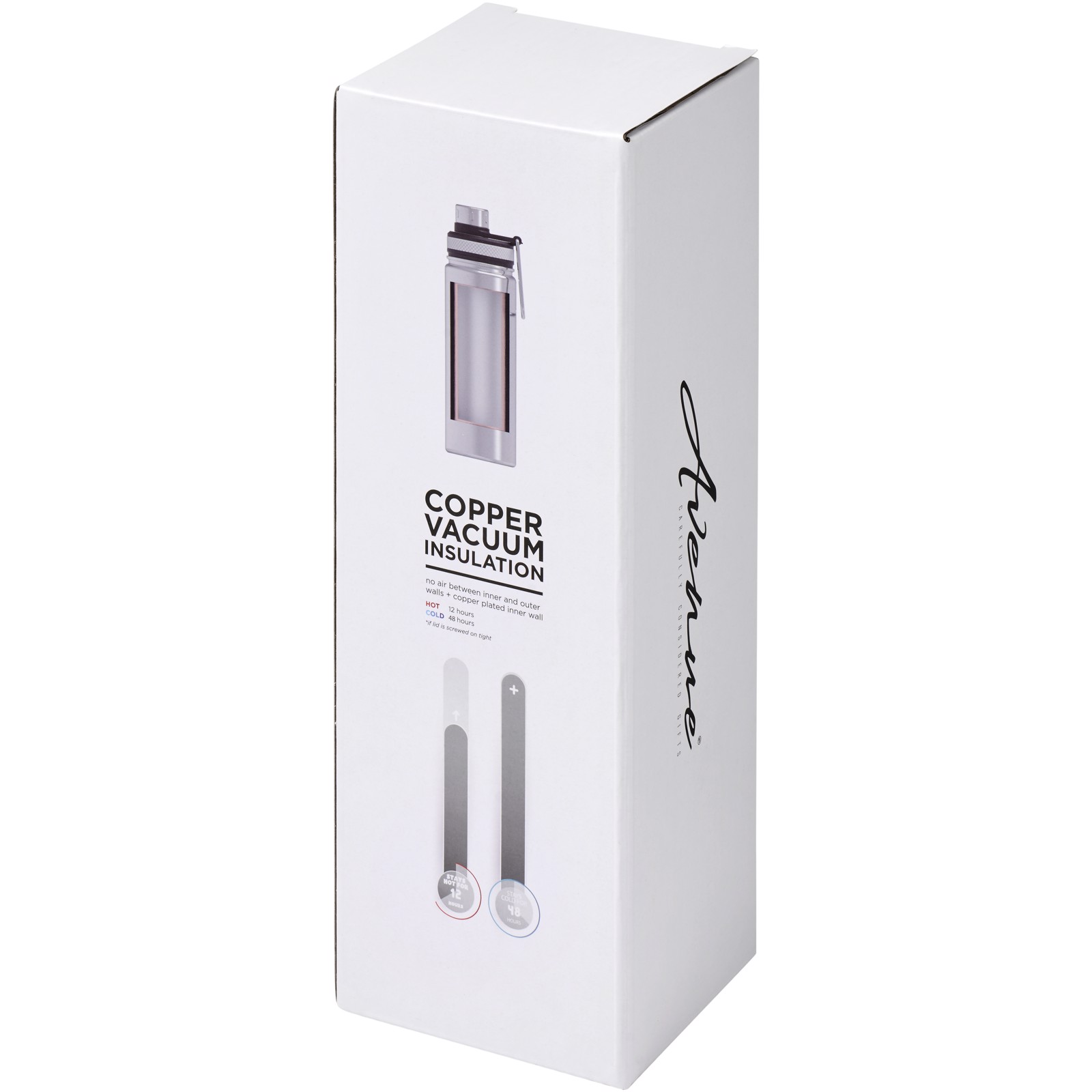 Doppelwandige Edelstahl-Vakuumkonstruktion mit Kupferisolierung, welche dafür sorgt, dass Ihr Getränk mindestens 12 Stunden lang heiß und 48 Stunden lang kalt bleibt. Die Konstruktion verhindert auch eine Kondensation an der Außenseite der Flasche. Ausgestattet mit einem Schraubverschluss und einem Edelstahldeckel mit einem praktischen Tragegriff. Konstruktion mit zwei Öffnungen für einfache Reinigung und Befüllung. Das Fassungsvermögen beträgt 590 ml. Präsentiert in einer Avenue-Geschenkschachtel.