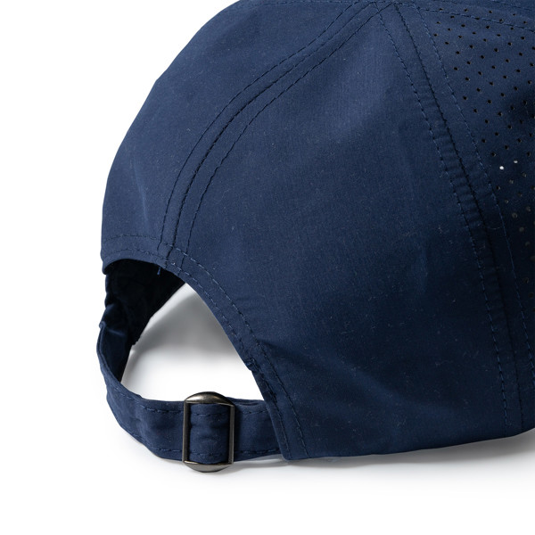 Atmungsaktive Sportkappe aus 100 % Mikrofaser, mit 6 Paneelen. Verstellbarer Schnallenverschluss und Belüftungsöffnungen. Abnehmbares Etikett.