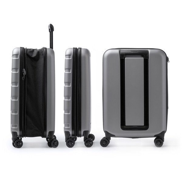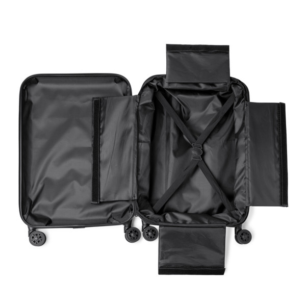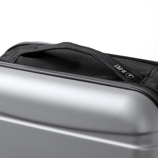 Kabinen Trolley aus 600D RPET Polyester. Außenfach mit Reißverschluss sowie Fronttasche mit Reißverschluss. Mit integriertem Zahlenschloss.