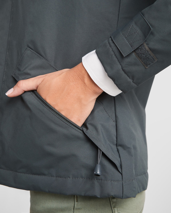 Wasser- und winddichter Parka mit Stehkragen.· Ton in Ton Reißverschluss mit Klettverschluß· Faltbare, abnehmbare Kapuze im Kragen · Außentaschen mit Reißverschluss, Lasche und Pullern. · Zwei Innentaschen mit Klettverschluss. · Verstellbare Ärmelbündchen.mit Klettverschlussschlaufen.· Veredlungszugang für Siebdruck oder Stick