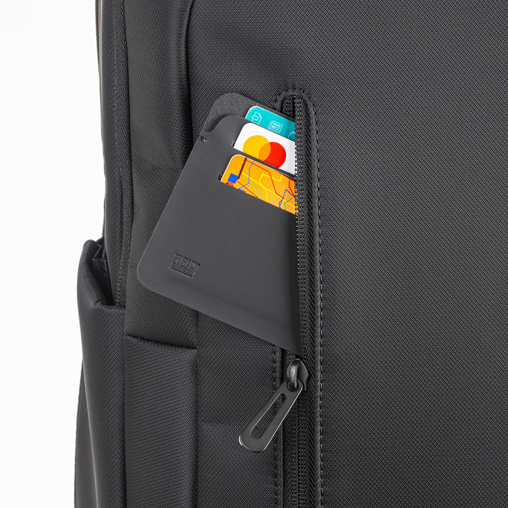 RFID Anti-Skimming Karte. Durch ein elektromagnetisches Feld werden alle 13,56 mHz Karten (z.B. für Bus, Bahn, Bank) durch diese Karte in einem Umfeld von 2-3cm vor Auslesen (Skimming) geschützt (Electronic Pick Pocketing). (0,9 mm). Rückseitig gedruckte Anleitung.