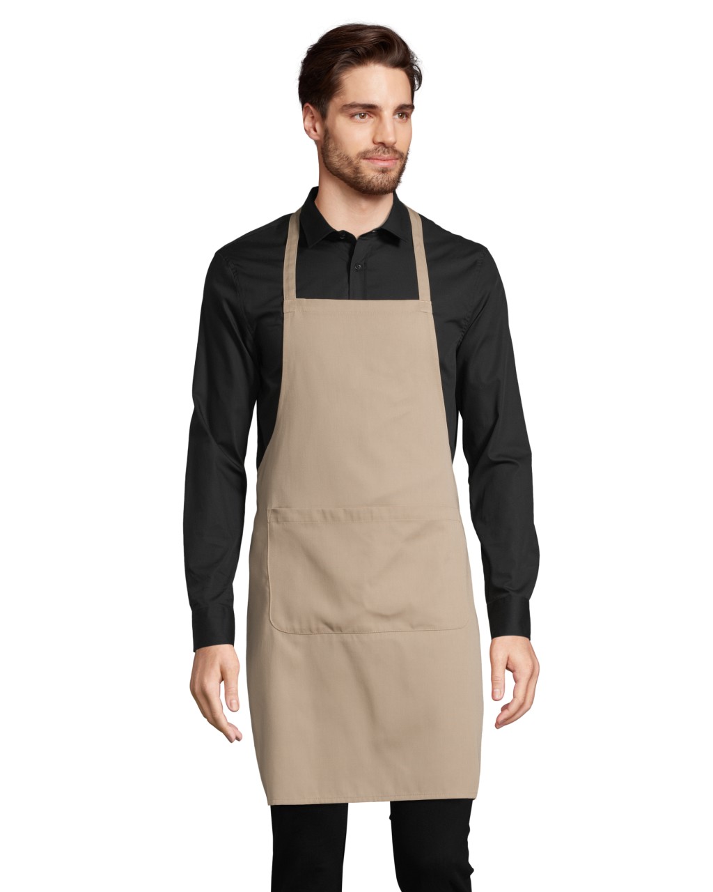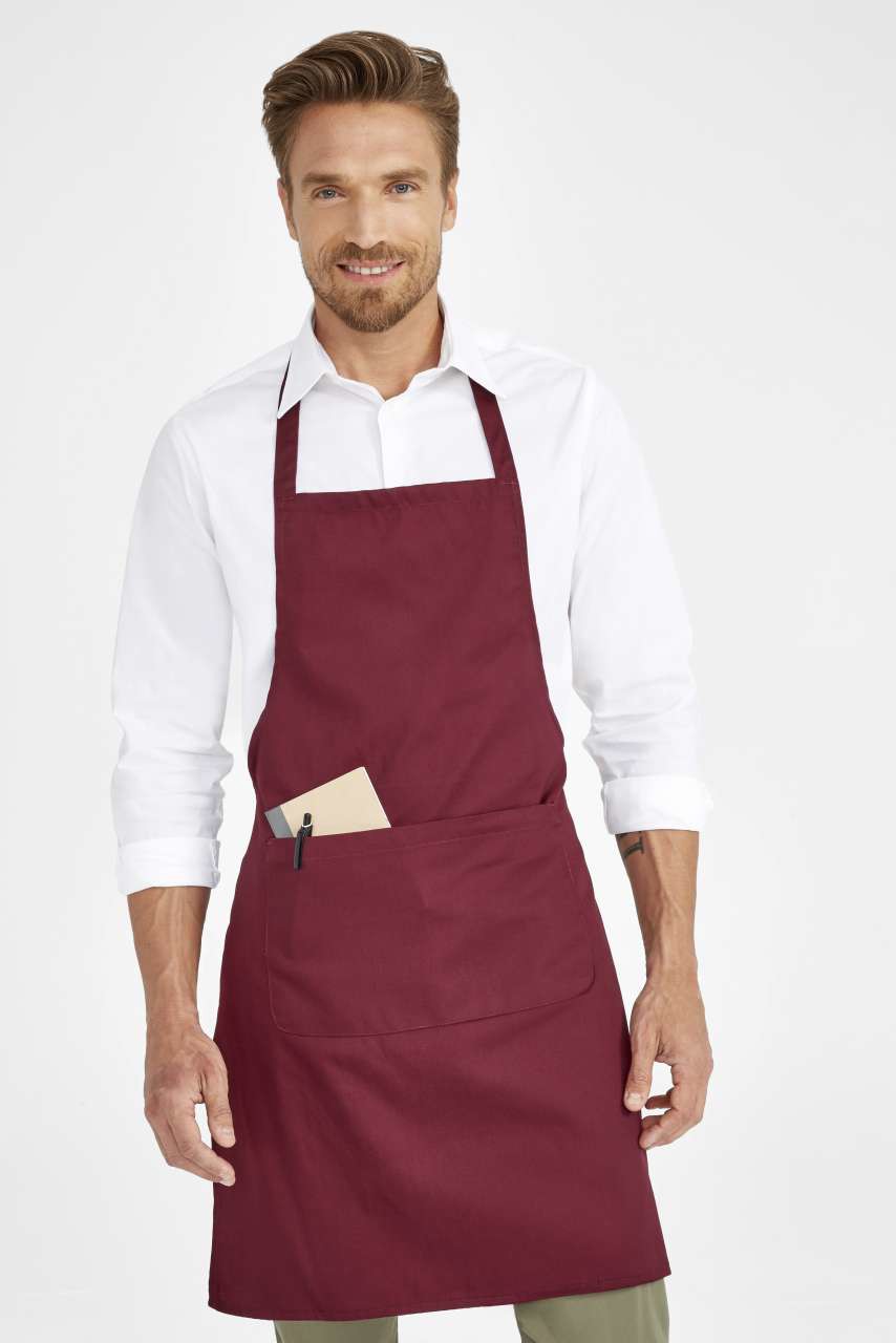 Küchenschürze mit verstellbarem Nackenband und 2 Fronttaschen. 10% Baumwolle / 90% Polyester, 190 g/m².