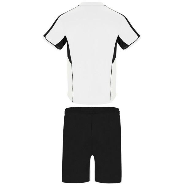 Atmungsaktives 2-teiliges Unisex-Sportbekleidungsset. Kombination aus 3 Stoffen, die vielseitige Leistung bieten. Weiches und bequemes Hauptmaterial, mikroperforiertes Gewebe an den Ärmeln für Atmungsaktivität. Mao-Kragen mit Druckknopfverschluss. Beininnenseite und Paspeln in Kontrastfarbe.