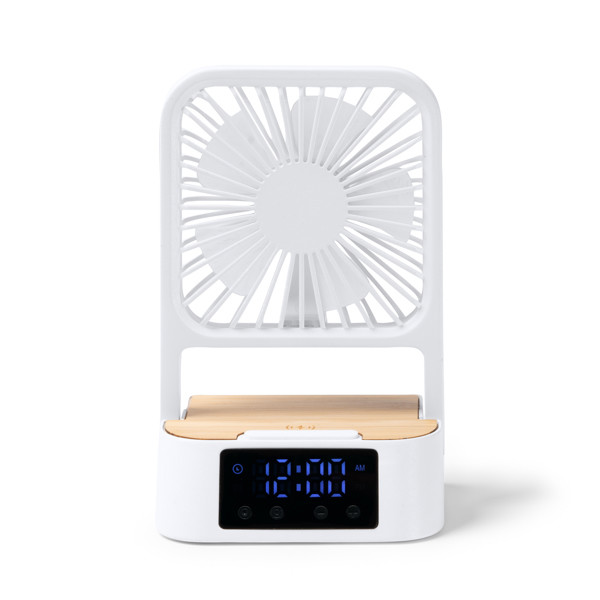 Desktop-Ventilator mit 3 Geschwindigkeiten, Uhrfunktion und kabellosem 15-W-Ladegerät. Hergestellt aus recyceltem ABS und Bambus. Einschließlich Typ-C-Kabel. Verpackung in ökologischer Designbox.
