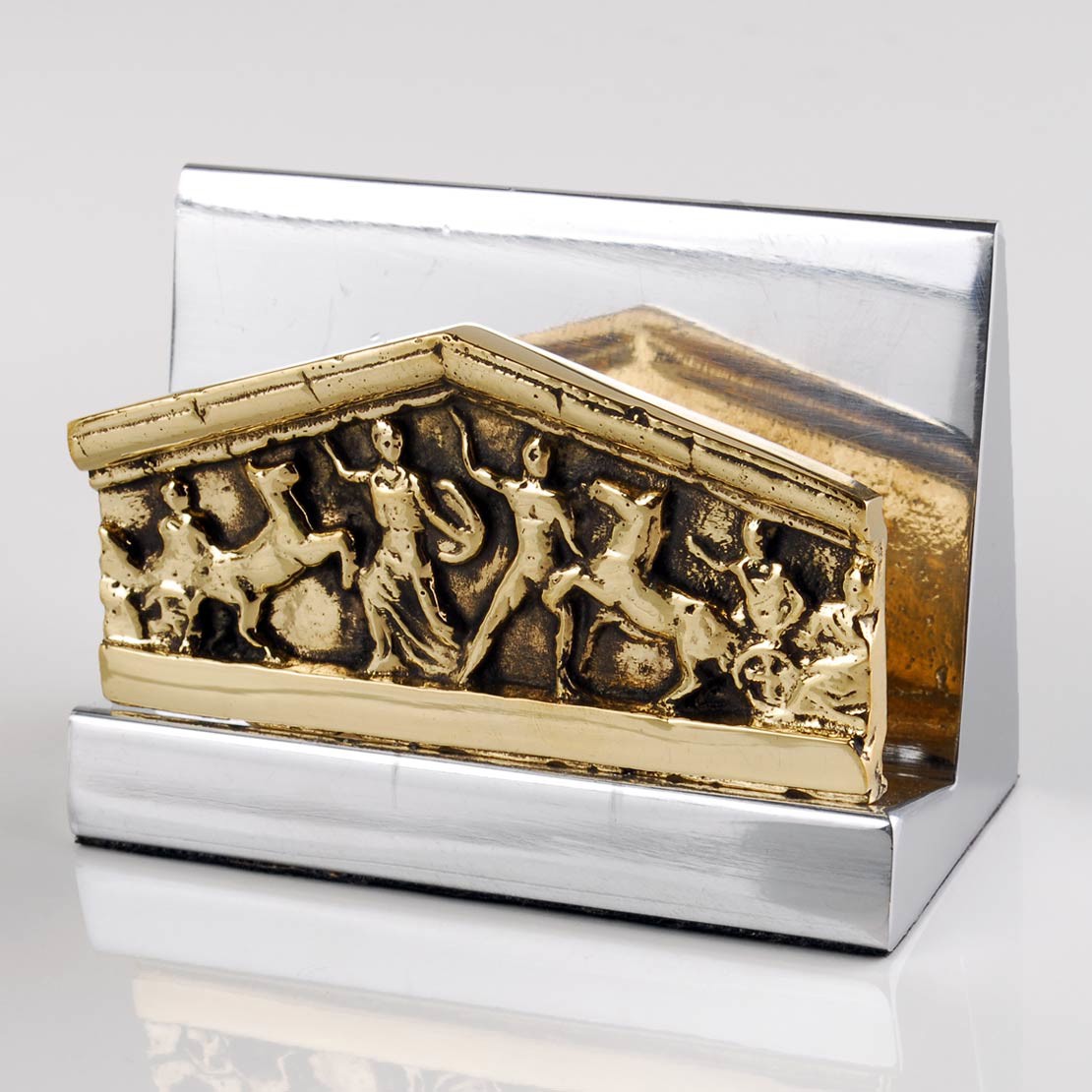 Καρτοθήκη “Αέτωμα”, εμπνευσμένο από τη ζωφόρο Ακρόπολης, από ορείχαλκο πάνω σε βάση μασίφ αλουμινίου (9,0×6,1×4,3 cm)