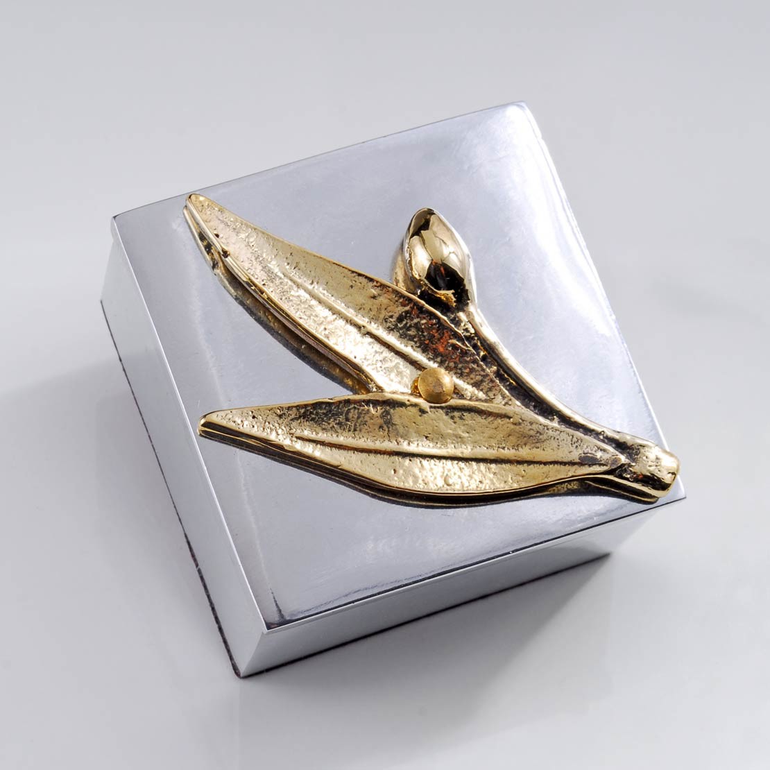 Κουτί τετράγωνο λείο από αλουμίνιο με ορειχάλκινo φύλλο ελιάς στο καπάκι (5,7×5,7×3,7 cm)