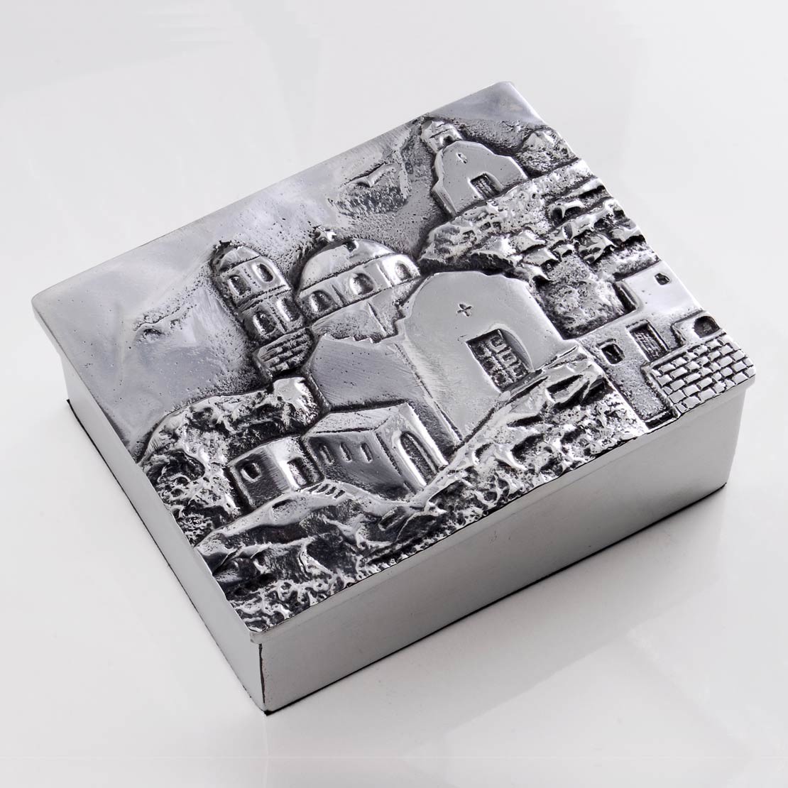 Κουτί γίγας “Σαντορίνη” με ανάγλυφο εκκλησάκι από αλουμίνιο (13,9×11,2×5,1 cm)