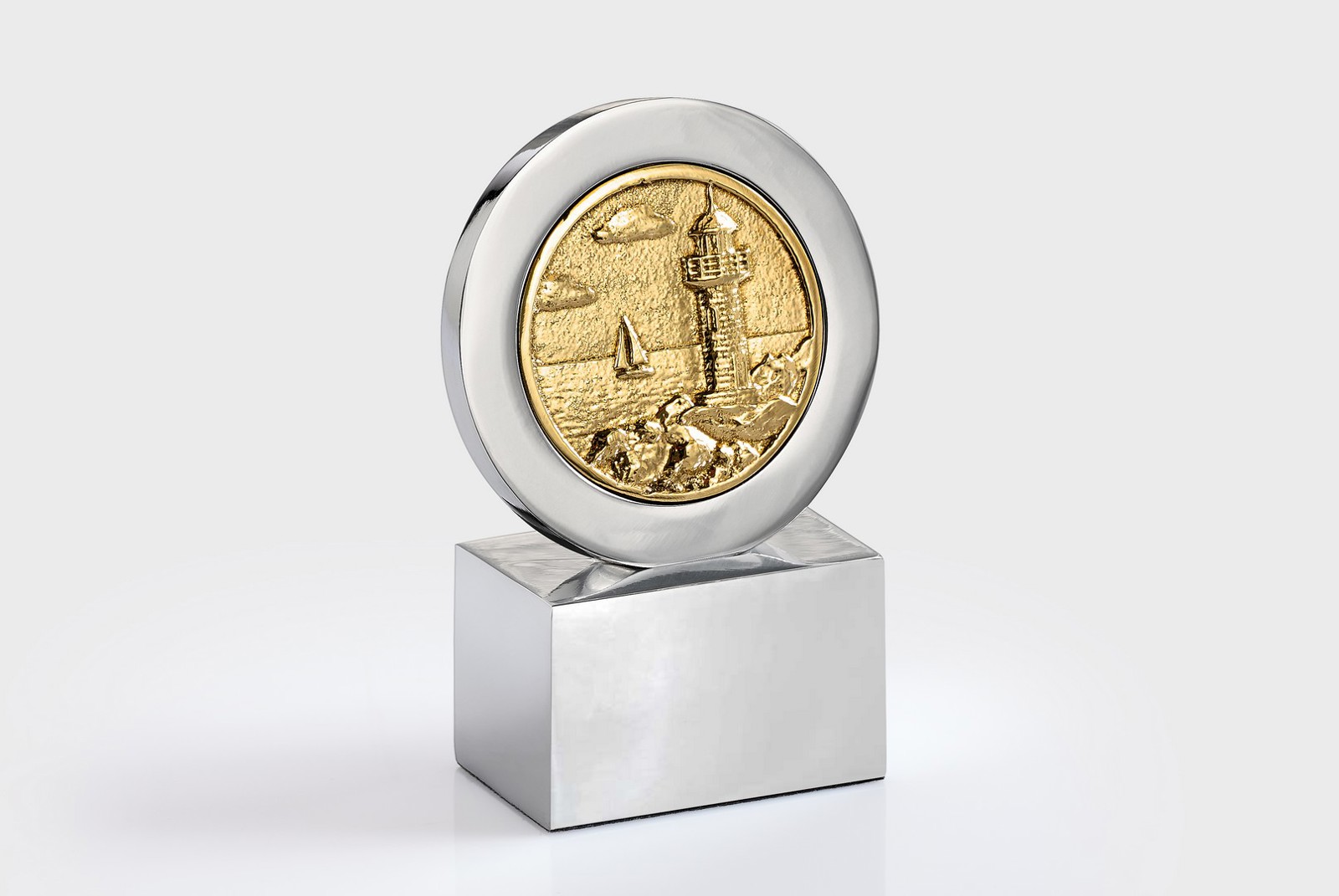 Αναμνηστικό δώρο συνεδρίου “Φάρος” – κορνίζα στρογγυλή αλουμινίου με ορειχάλκινο χυτό θέμα επιλογής σας πάνω σε βάση αλουμινίου (6,3x4x4cm)
