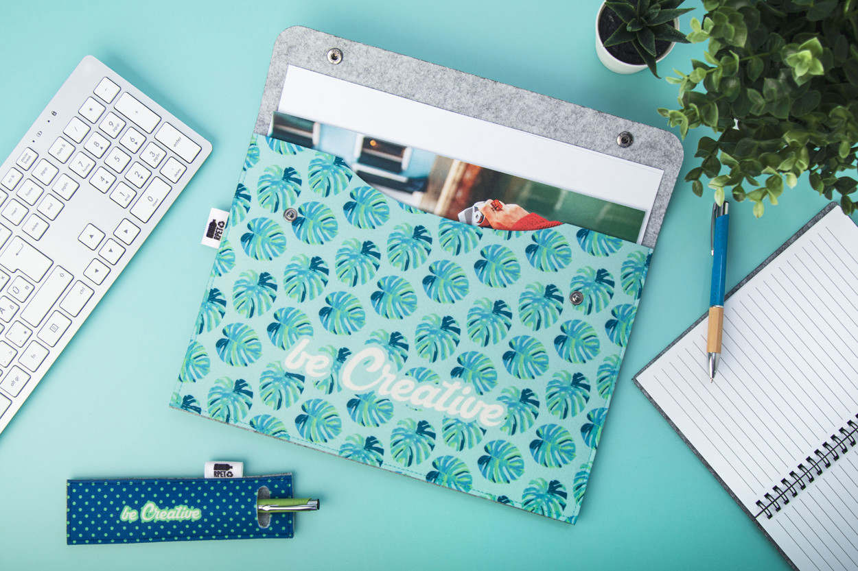 Προσαρμοσμένος φάκελος εγγράφων από τσόχα RPET (μέγεθος A4) με έγχρωμη εκτύπωση στην μπροστινή πλευρά και κλείσιμο με πρέσα. Με χαρακτηριστική ετικέτα RPET. Η τιμή περιλαμβάνει εκτύπωση εξάχνωσης. MOQ: 25 τεμάχια.