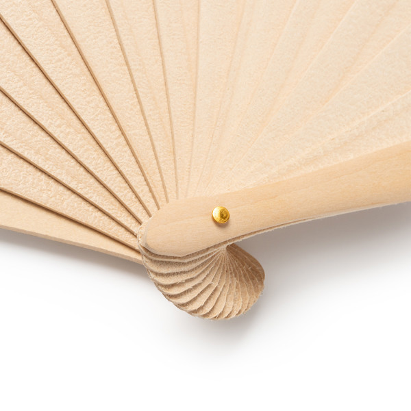 Βεντάλια χειρός με ξύλινες νευρώσεις και πολύχρωμο ύφασμα. Παρουσίαση σε λευκό κουτί.