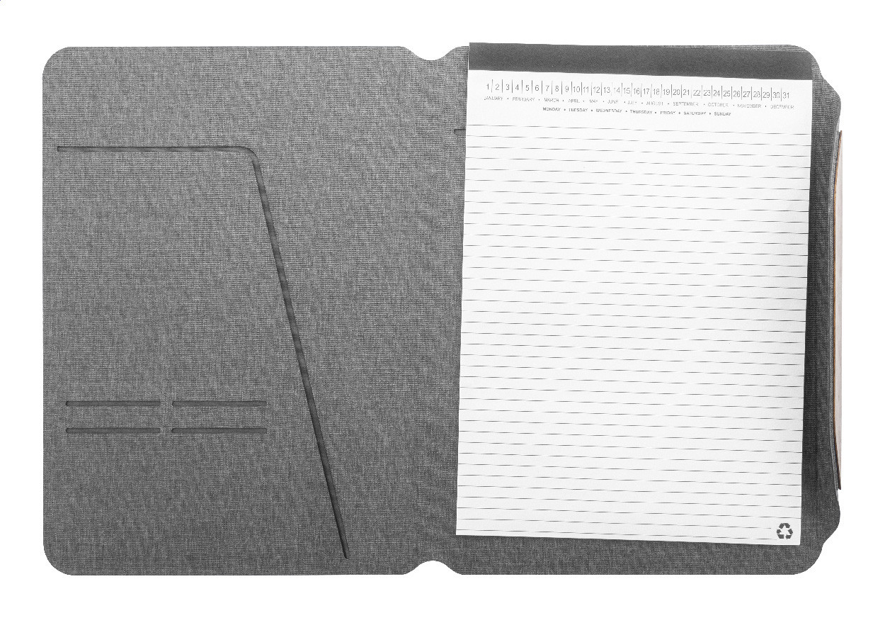 A4 sized, RPET polyester document folder with multiple inside organizer pockets and magnetic closure with walnut wood detail. With 20 lined sheets notepad in recycled paper.