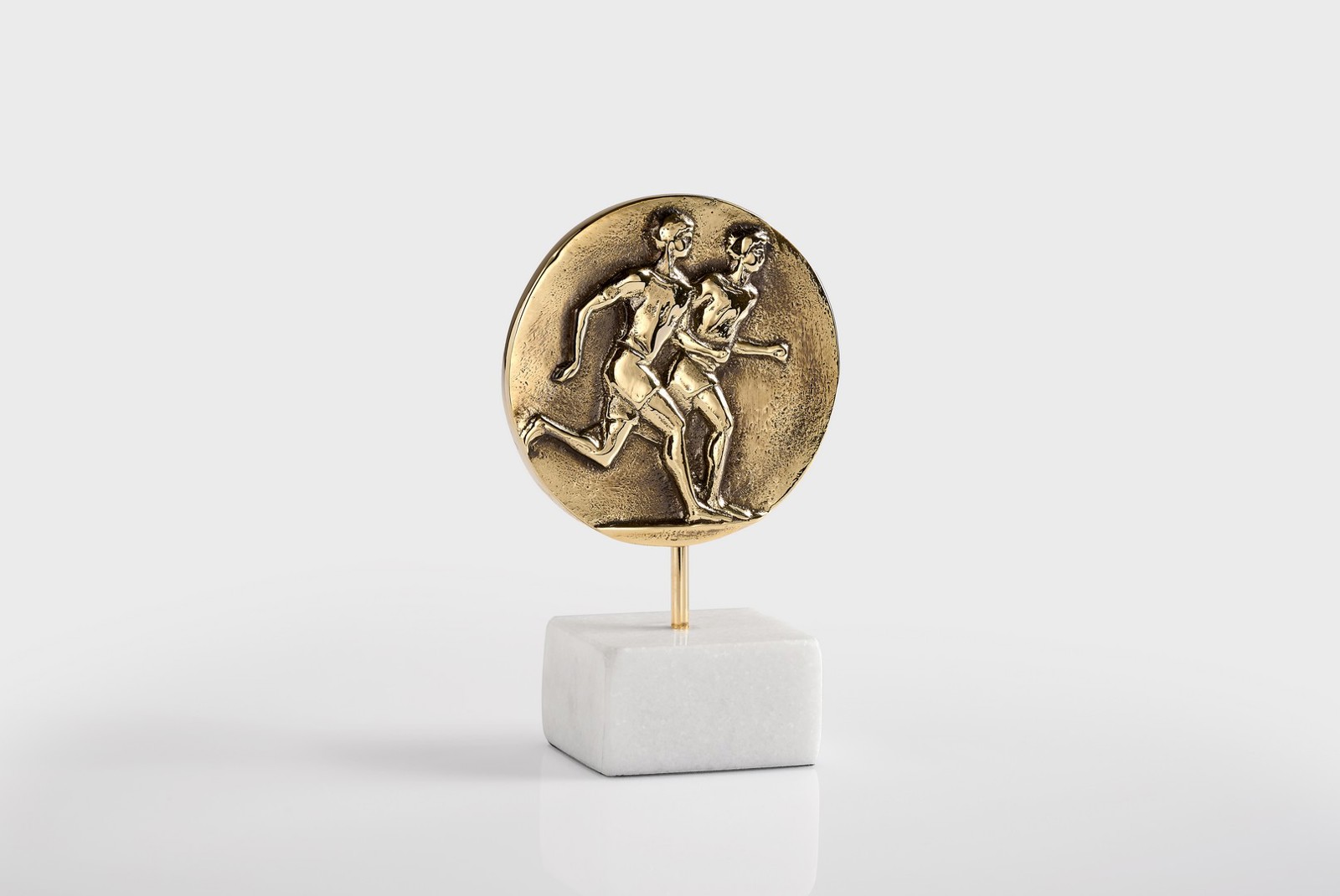 Large bronze medal on marble base, depicting runner boys (5x4x3cm)