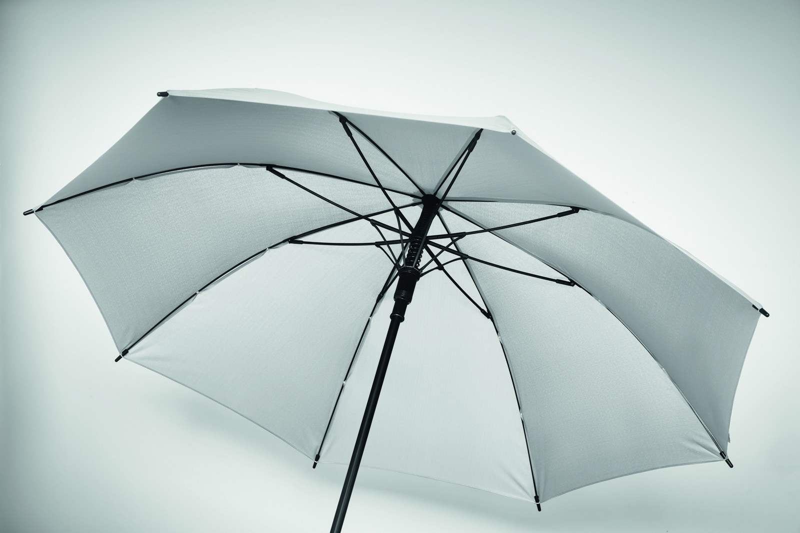 23 inch auto open windproof umbrella in 190T pongee with fiberglass frame and black plated shaft and plastic tips. ABS handle with rubber finish. Manual closure.