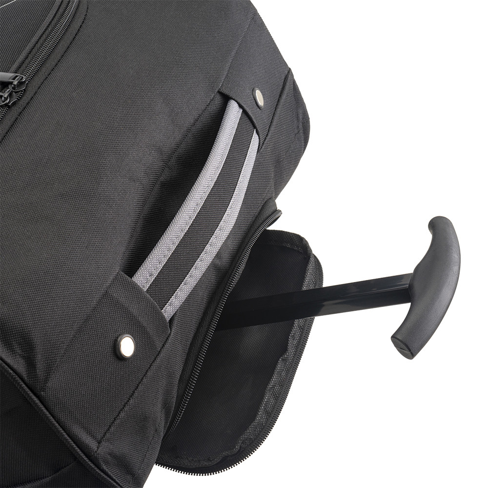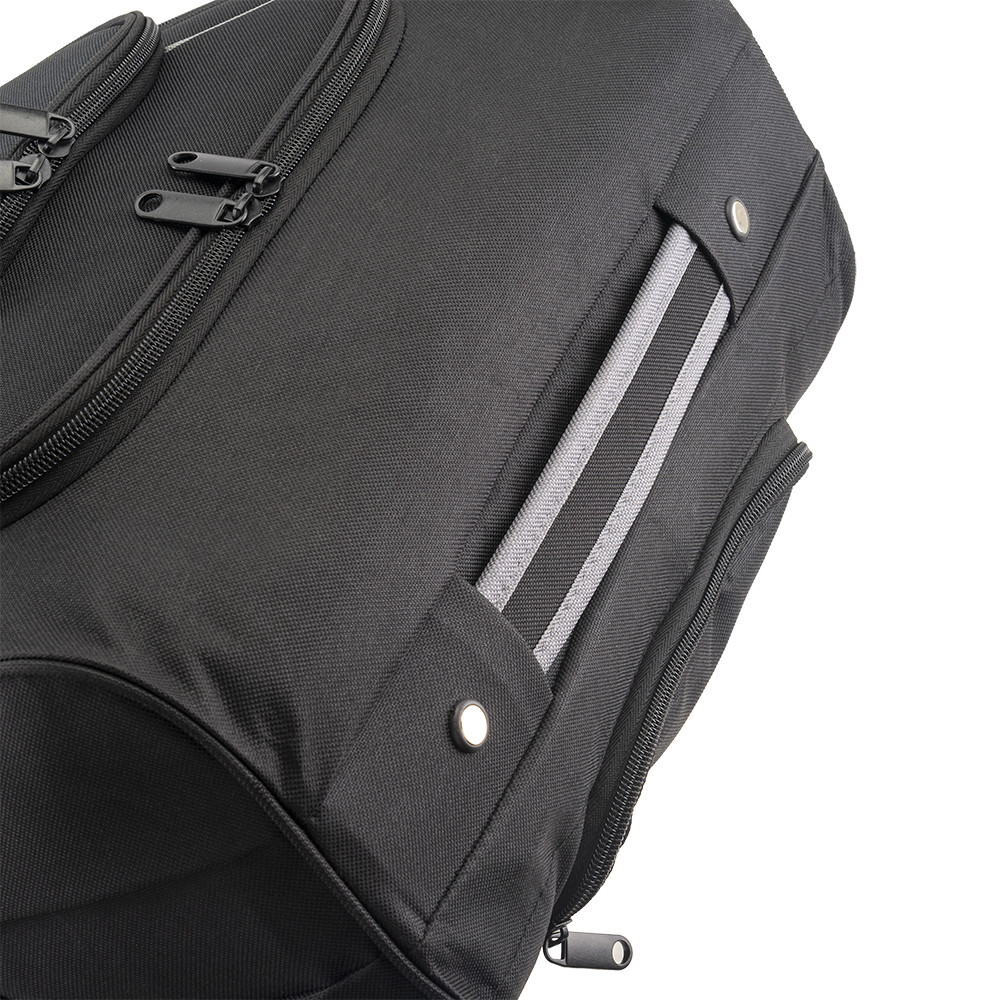 Business trolley including a 17 inch laptop pocket and 10 inch tablet pocket with several compartments. 1680D polyester.