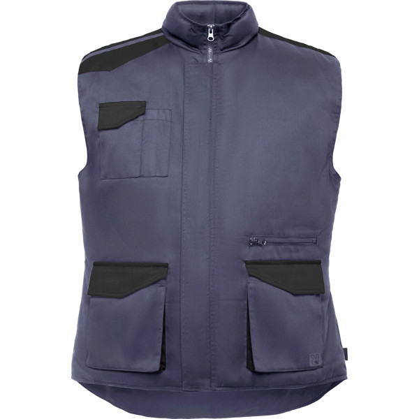 Padded multi-pocket work vest with extended back.· Front zip with placket and velcro closure.· Overlapping contrasting pieces on the shoulders.· Multi-purpose right chest pocket.· Two front double-access pockets (side and top) with gusset and contrasting flap.· Zip pocket on the right side.· Elasticated adjustable armholes. · Adjustable flaps on the sides with snap buttons.· Interior left pocket with velcro closure.· Outer Roly WRK label.