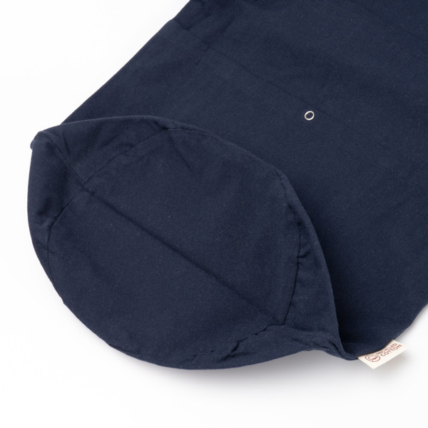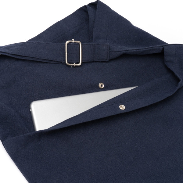 Bag made of recycled cotton of 240 g/m² with front pocket, button closure and inner pocket. Adjustable handle.