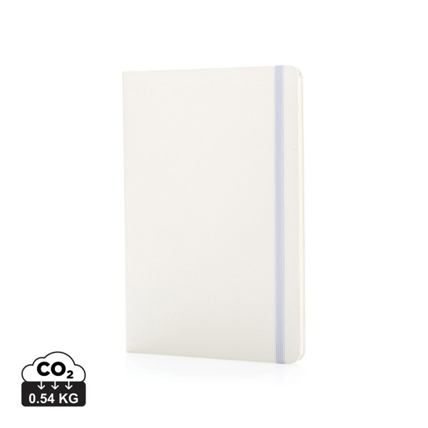 A5 notebook with hard PVC cover. Casebound. 192 squared recycled paper pages (96 sheets). Matching elastic closure strap and ribbon bookmark.