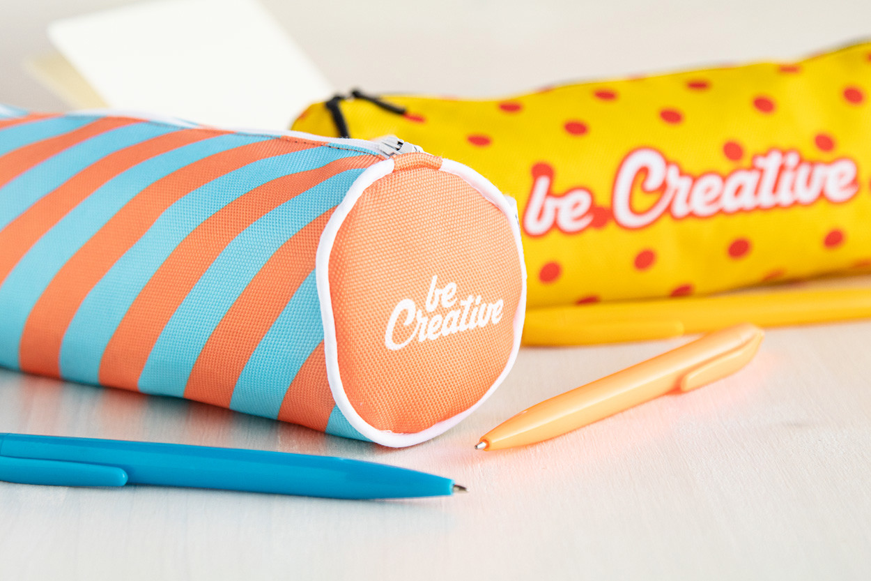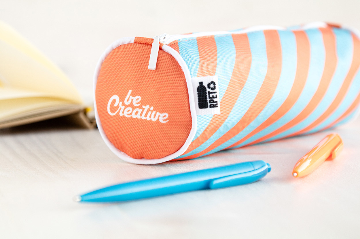 Custom made, round shaped zipped pen case in 600D RPET polyester. With all over sublimation printed graphics and distinctive RPET label. MOQ: 50 pcs.