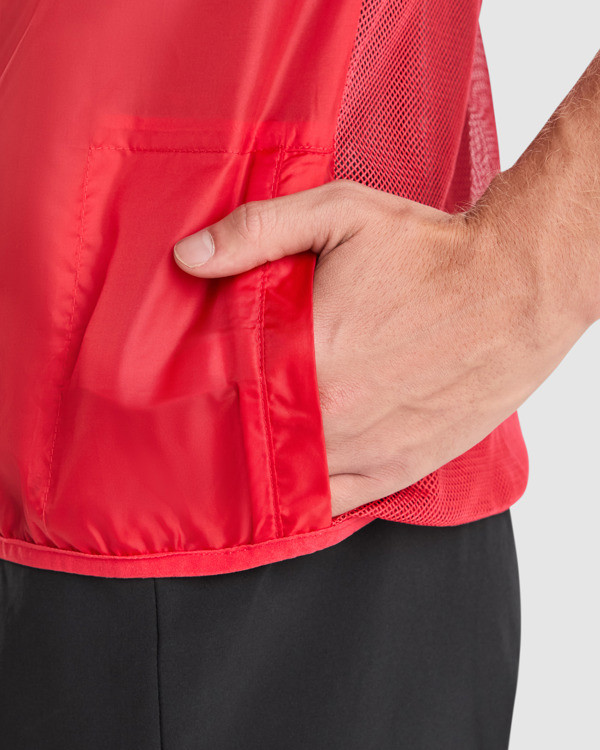 Ultra-light windbreaker vest. Tone-on-tone front zip. Chin guard. Back in breathable mesh fabric. Reflective strips on the front and back of the shoulders for enhanced visibility. Armholes and hem with elastic binding in matching colour. Left side pocket for folding.