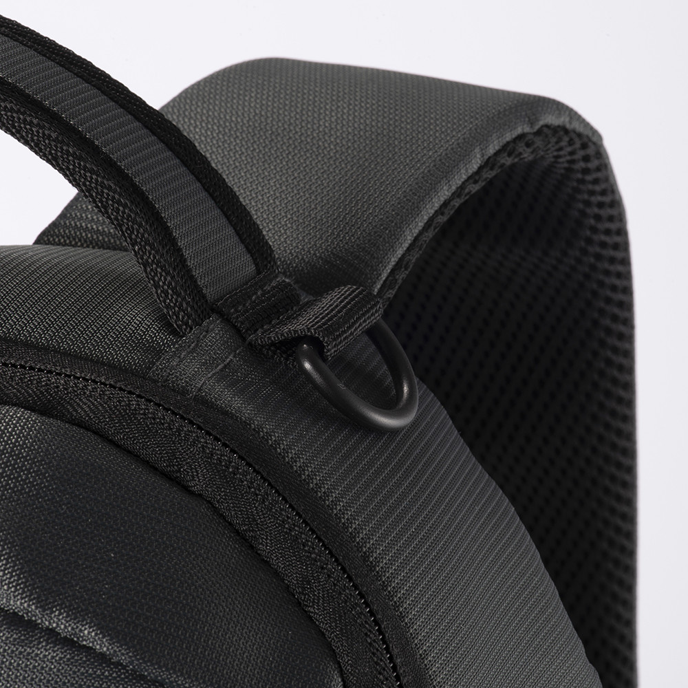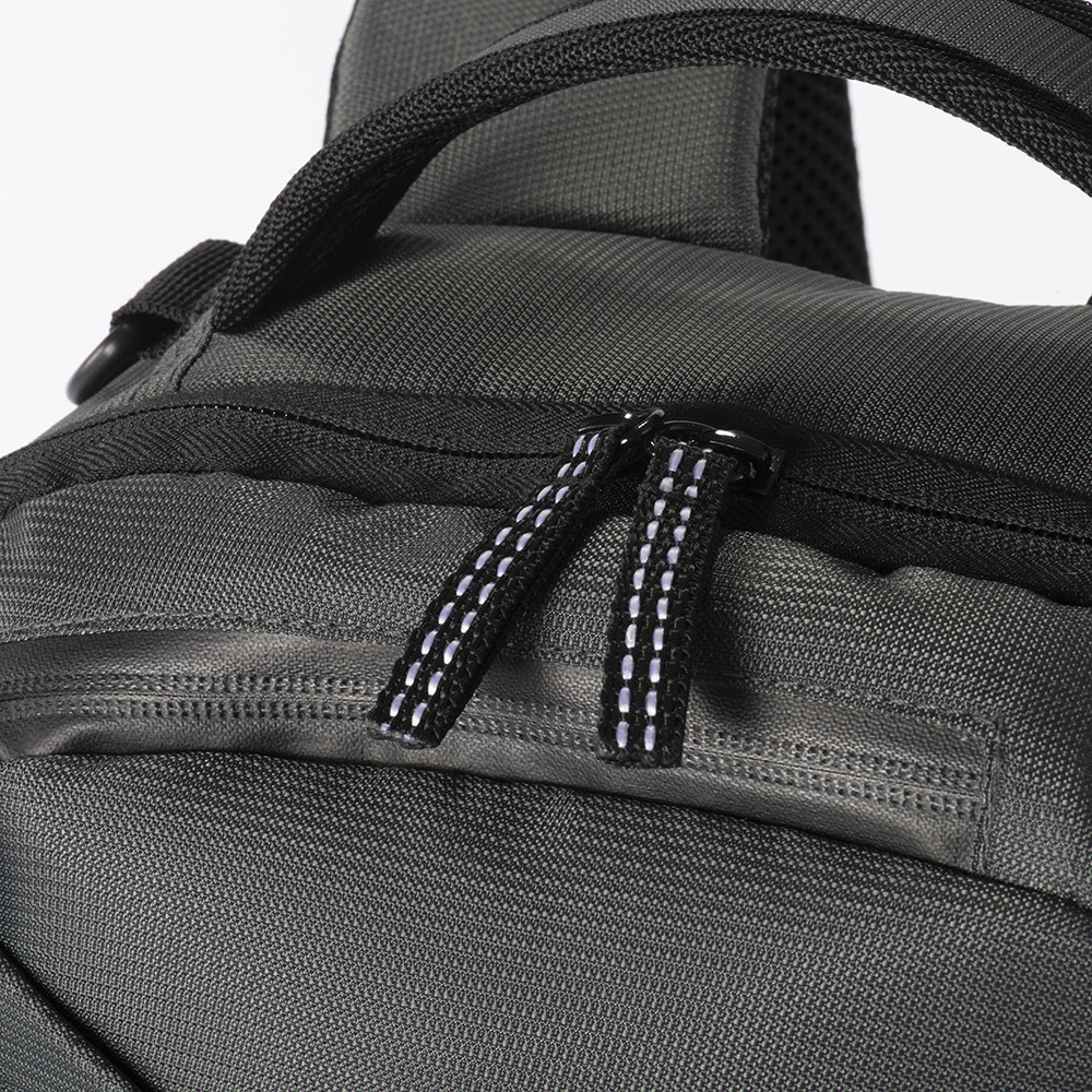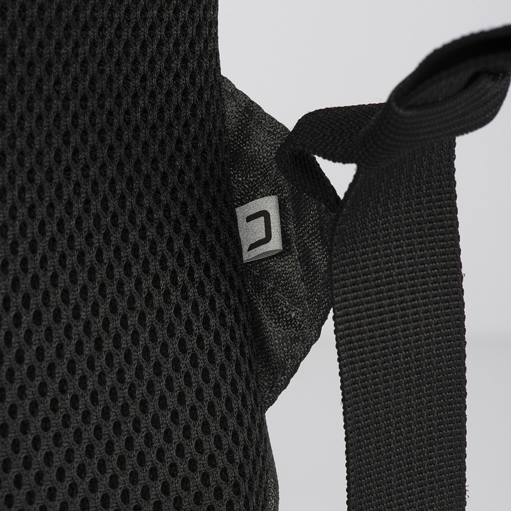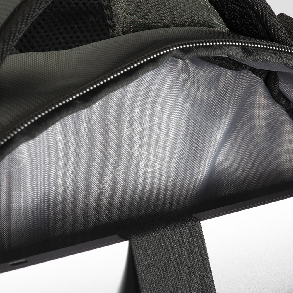 Laptop backpack in recycled PET. Padded notebook compartment. Backrest and shoulder straps padded with breathable material. Trolley attachment system