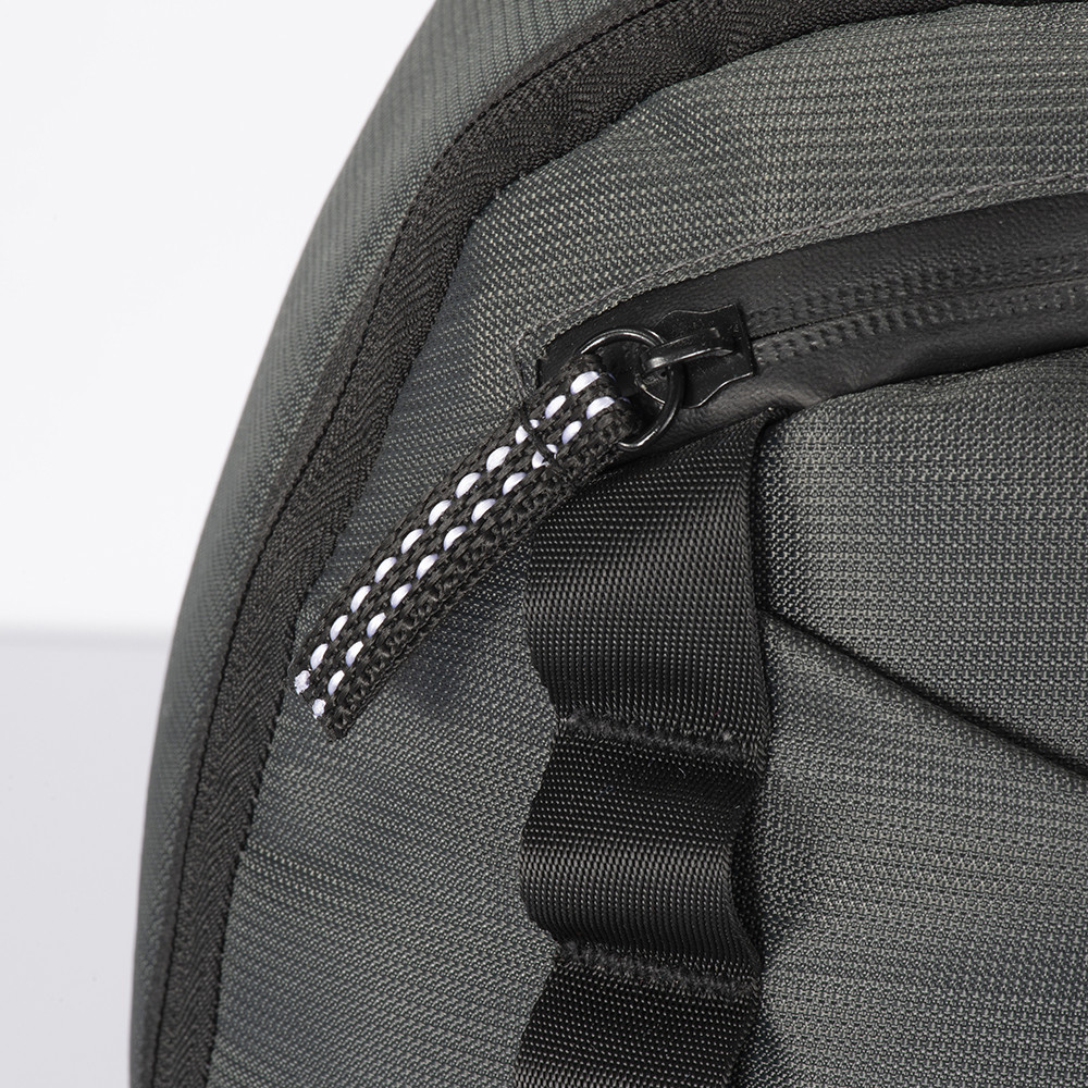 13 inch laptop backpack in 600D 2 tone polyester with outside pocket with zipper. Zipper main compartment on backside for better protection.