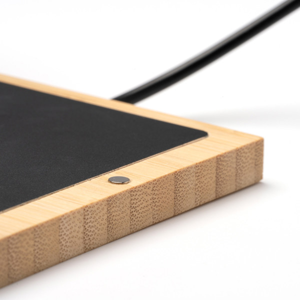 Double coil wireless charger for 1 device in bamboo casing and with stand and pen holder functionality. Output: DC5V/1A (5W). Bamboo is a natural product, there may be slight variations in colour and size per item, which can affect the final decoration o