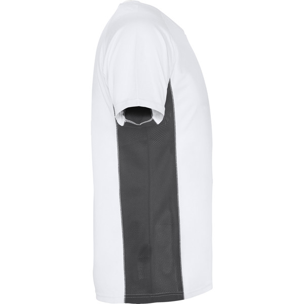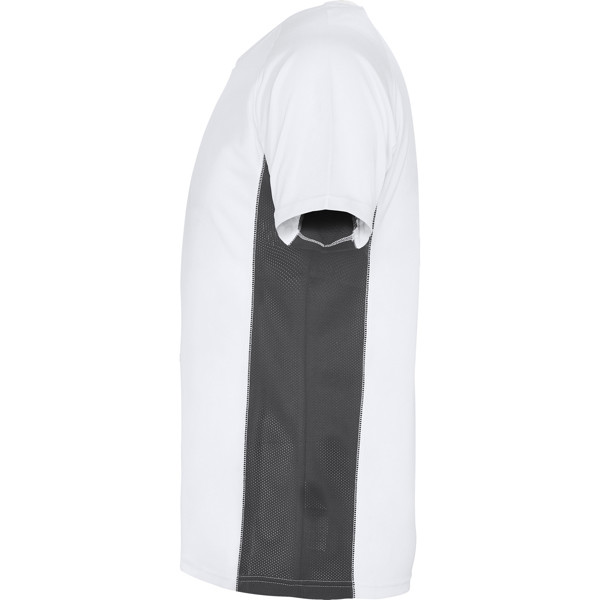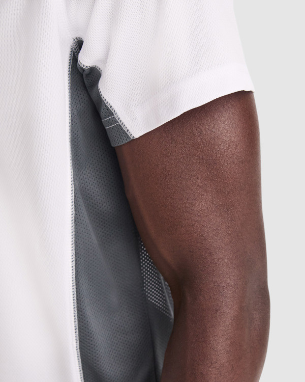 Main fabric: 100% bird's eye polyester. Side panels: 100% microperforated polyester, 140 gsm.