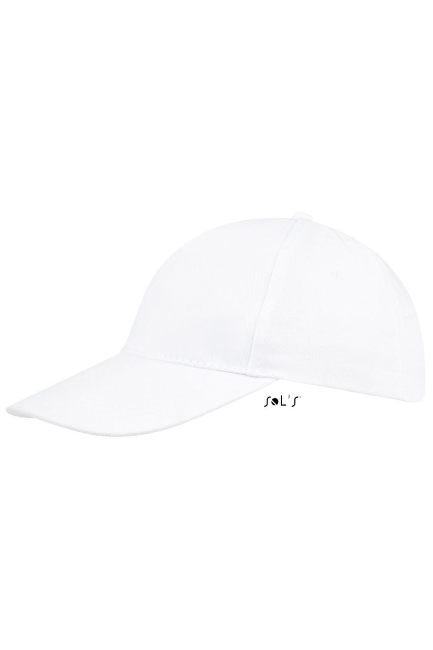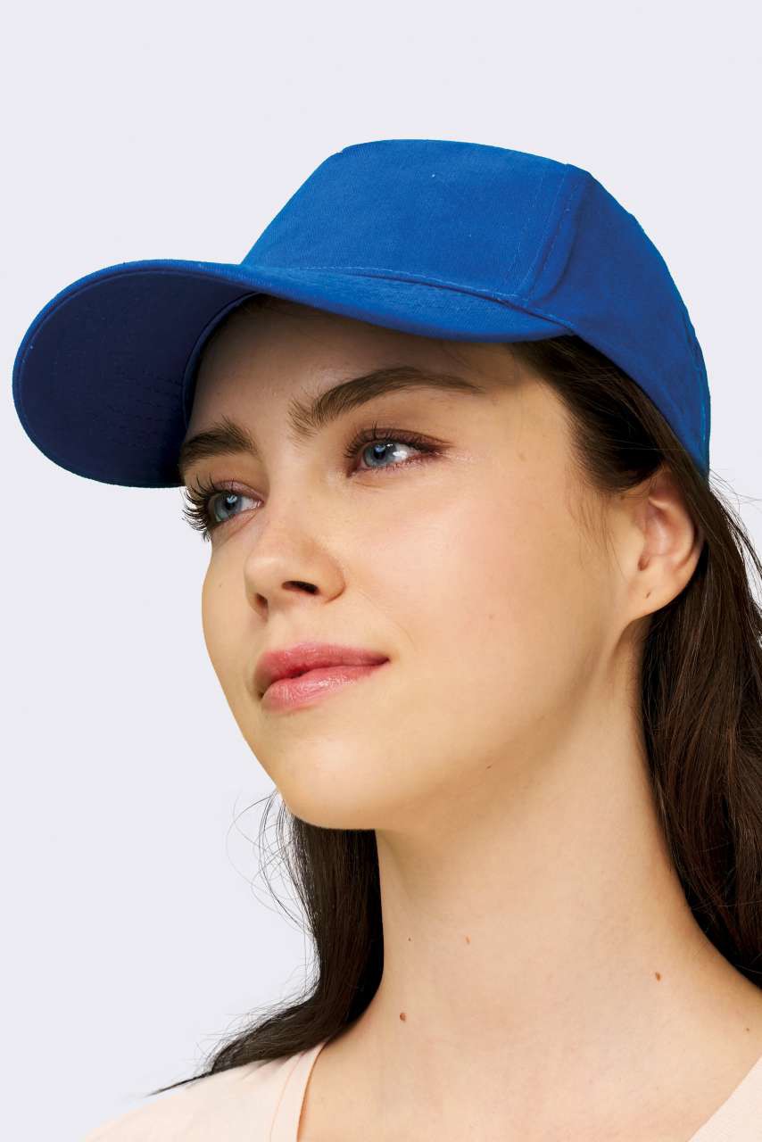 5 panel baseball cap in cotton twill 160 gr/m2 with adjustable plastic snap closure. 2 metal eyelets with matching colour plating. Size 7 1/4.