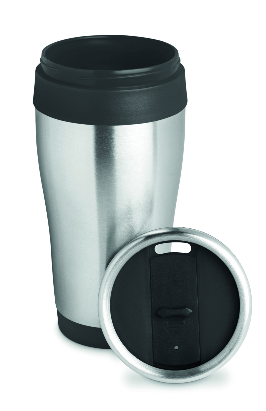 Double wall stainless steel travel cup with black PP lid. Capacity: 400 ml.