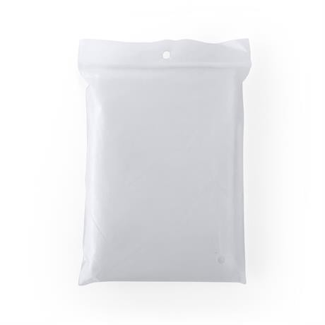 Foldable plastic poncho with attached hood, packed in a transparent polybag.
