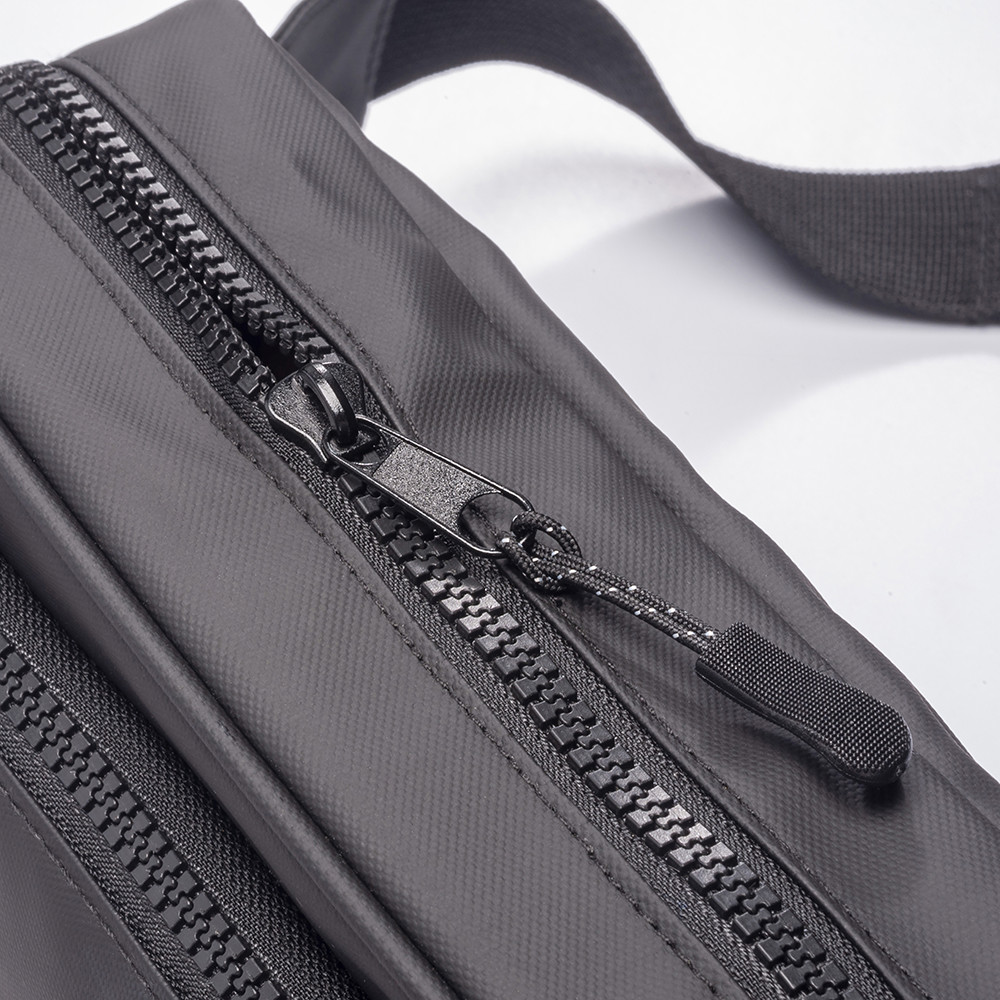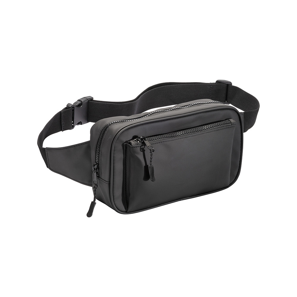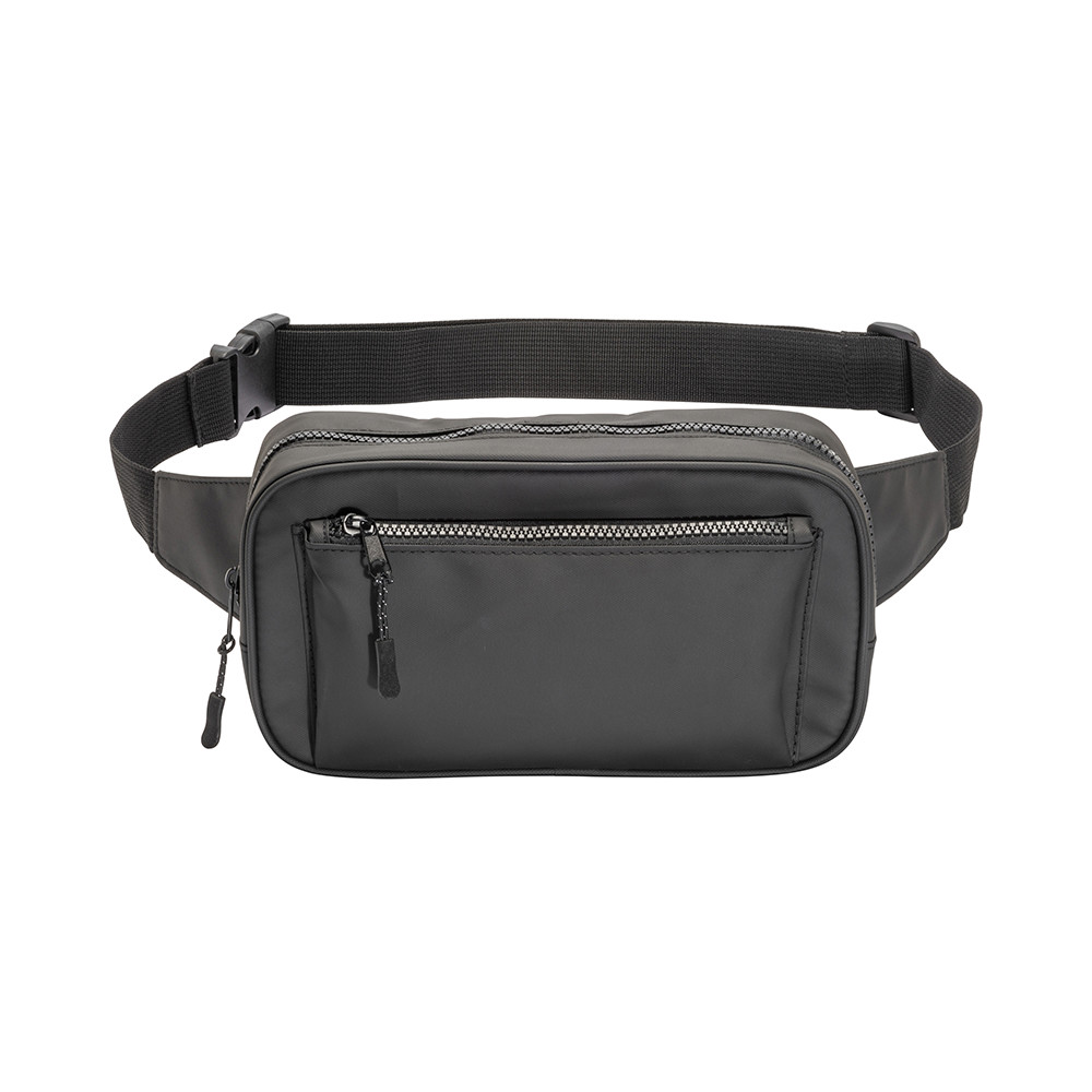Fanny bag in 210D polyester with zippered main compartment and adjustable waist strap.